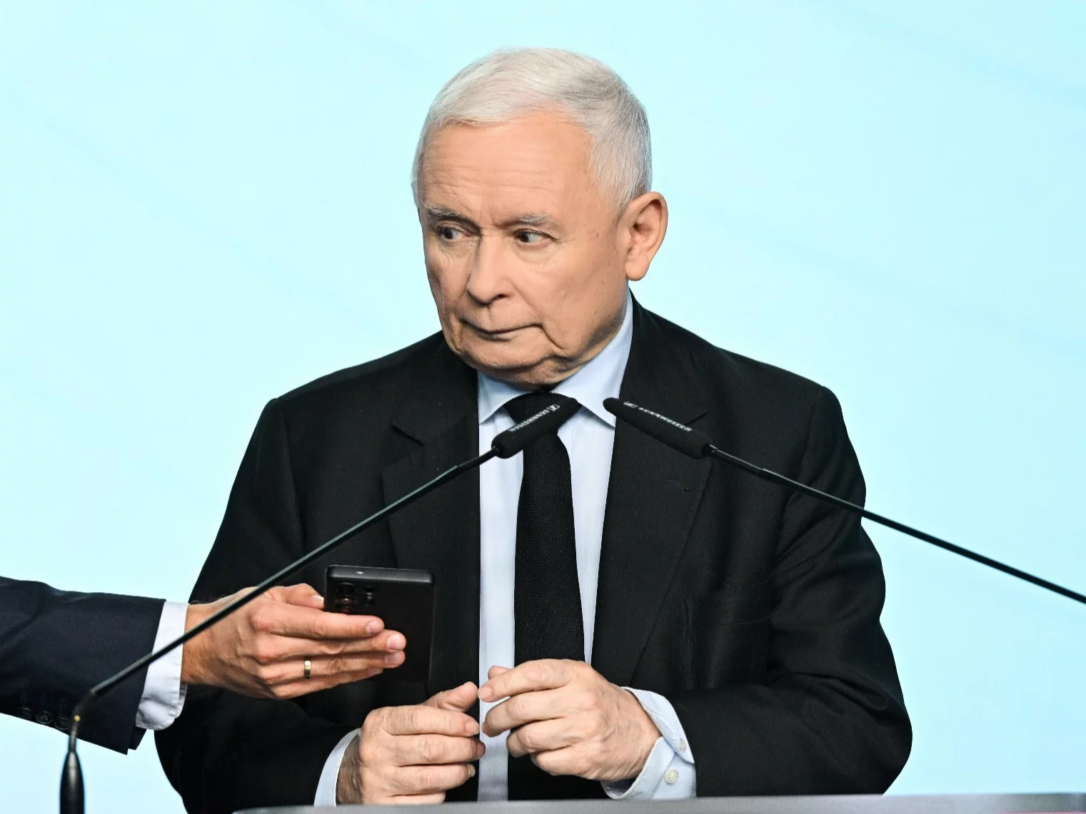 At some point,the phone rang in the room. It turned out that someone was trying to call Kaczyński. The former prime minister took his phone out of his pocket and quickly looked for an option to mute the ringer. He then returned to his speech.